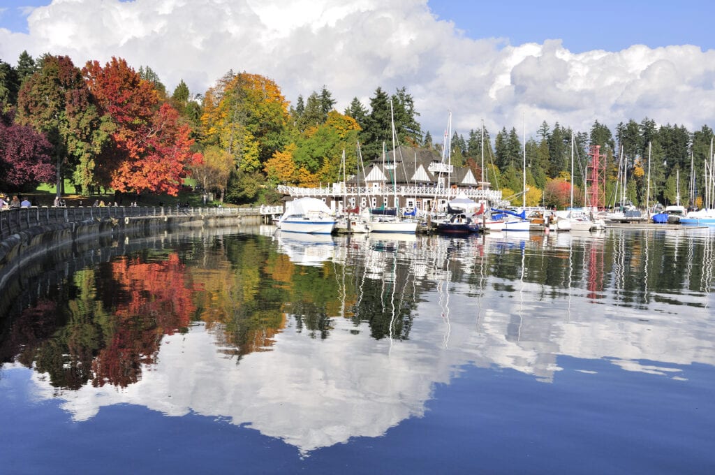 The seawall stretches for 9 kilometres/5.5 miles around the perimeter of the park, snaking next to the shimmering waters of Burrard Inlet and English Bay. It offers arguably the best view of the skyline of Vancouver’s downtown core as well as the North Shore Mountains, all on one multi-use path. The Bigleaf Maple and Black Cottonwood trees that border the seawall create a beautiful collage of colour as they bask in the autumn air. Other highlights include Siwash Rock, the Girl in the Wetsuit statue, and passing underneath the famous Lions Gate Bridge.